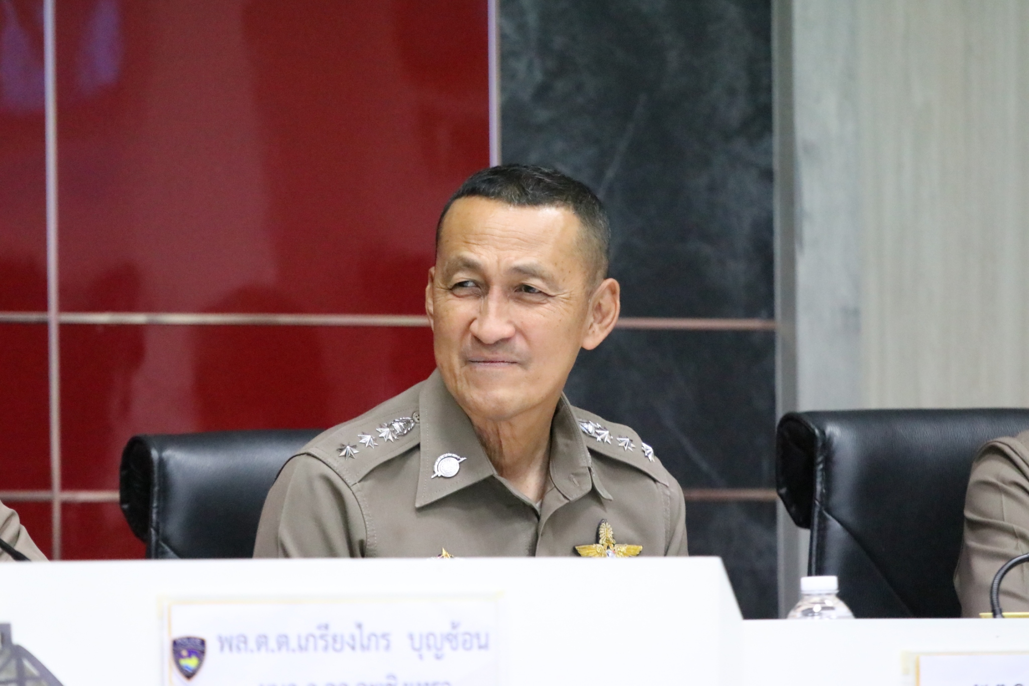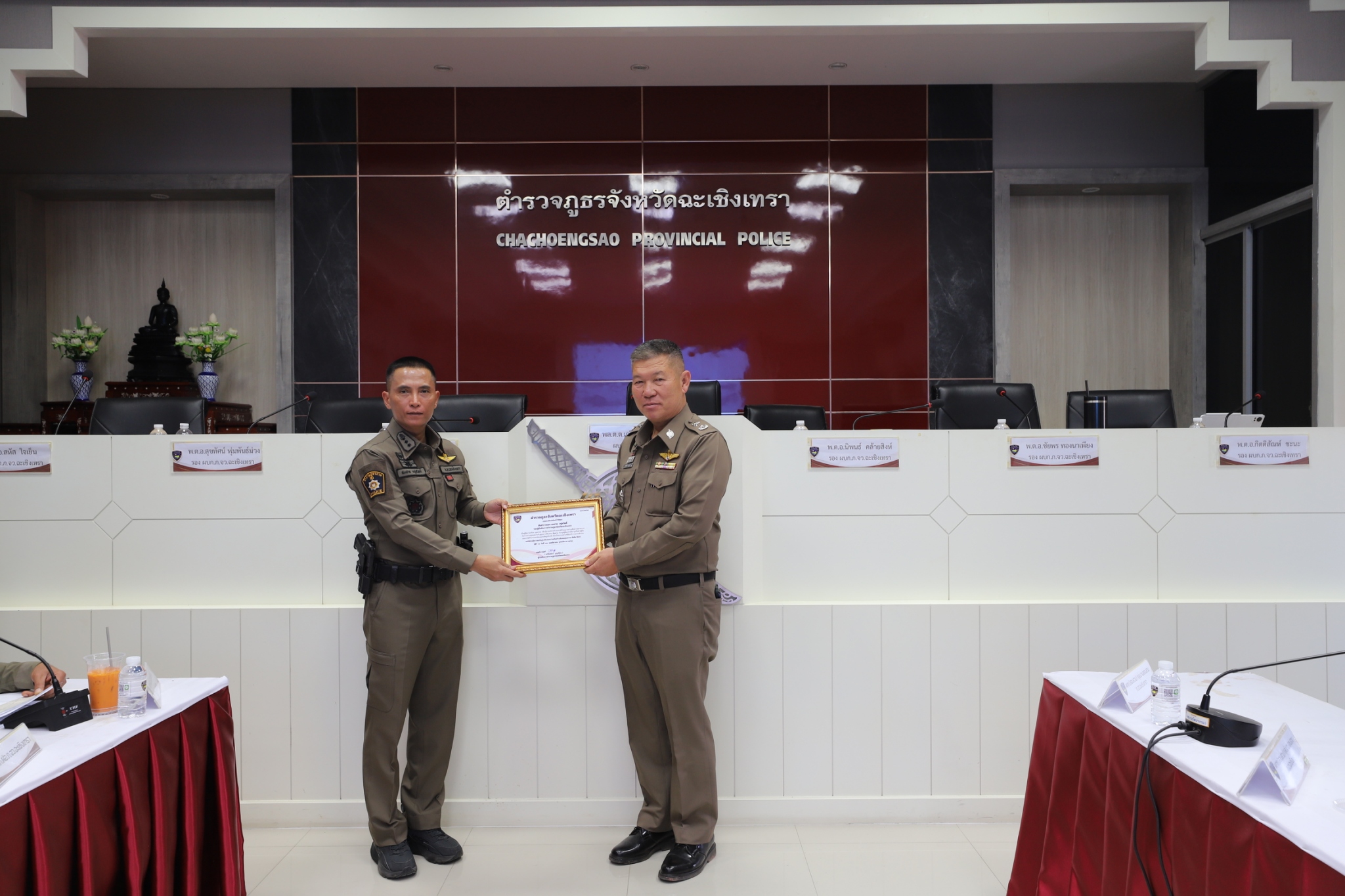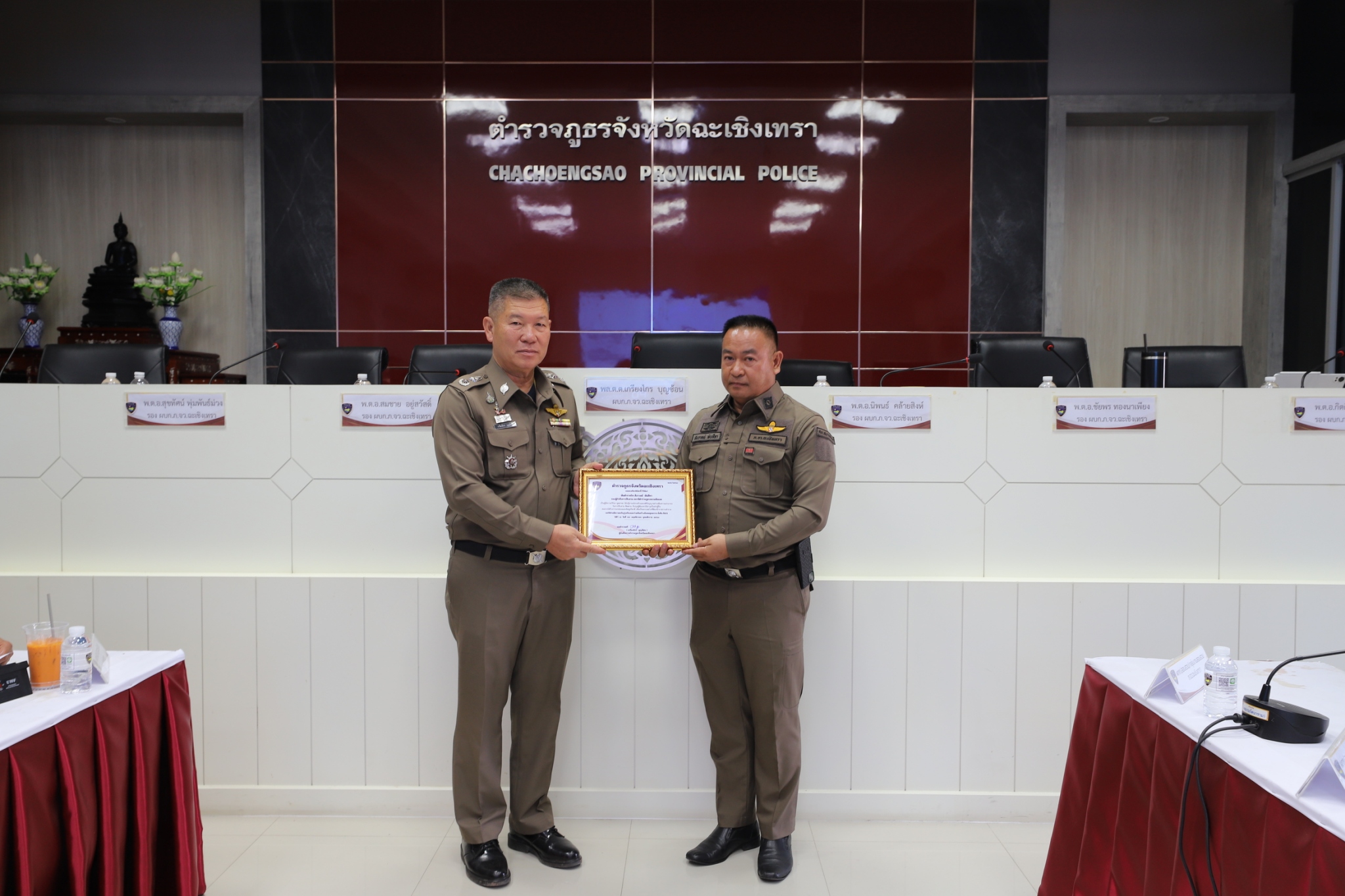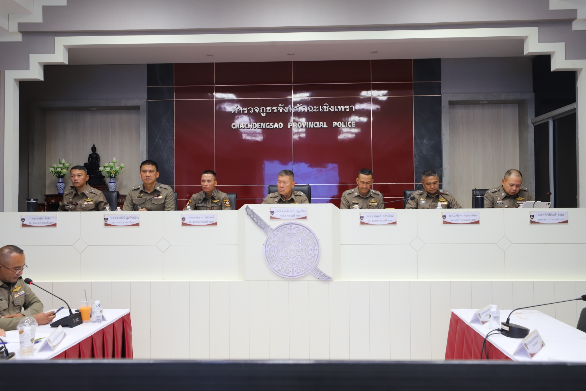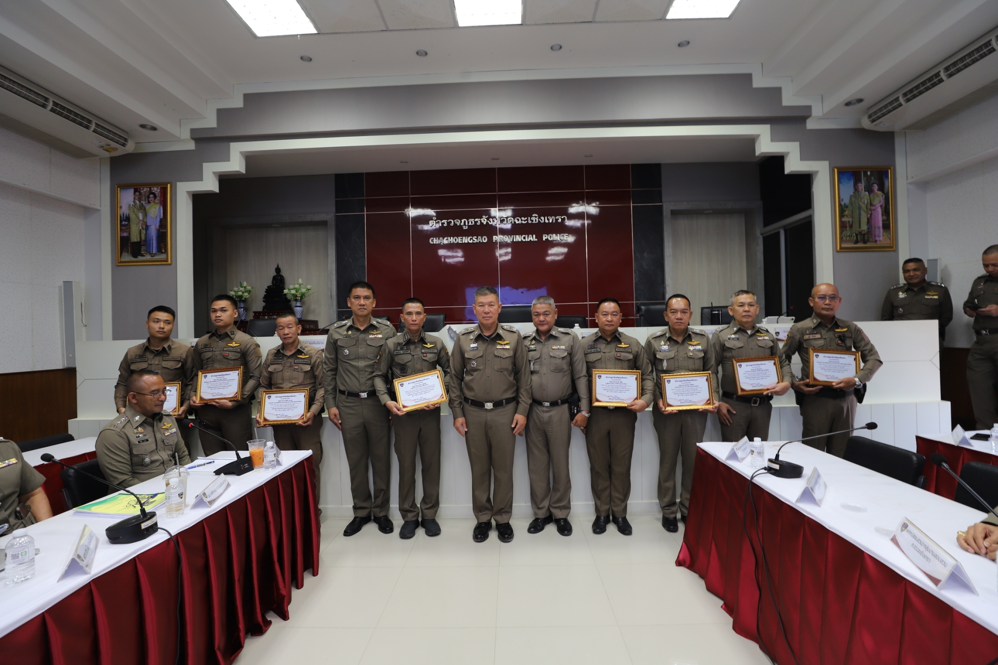 พล.ต.ต.เกรียงไกร บุญซ้อน ผบก.ภ.จว.ฉะเชิงเทรา ,พ.ต.อ.สุขทัศน์ พุ่มพันธ์ม่วง รอง ผบก.ภ.จว.ฉะเชิงเทรา, พ.ต.อ.สมชาย อยู่สวัสดิ์ รอง ผบก.ภ.จว.ฉะเชิงเทรา, พ.ต.อ.นิพนธ์ คล้ายสิงห์ รอง ผบก.ภ.จว.ฉะเชิงเทรา, พ.ต.อ.ชัยพร ทองนาเพียง รอง ผบก.ภ.จว.ฉะเชิงเทรา, พ.ต.อ.สหัส ใจเย็น รอง ผบก.ภ.จว.ฉะเชิงเทรา, พ.ต.อ.กิตติสัณห์ ชะนะ รอง ผบก.ภ.จว.ฉะเชิงเทรา, หน.สภ.ในสังกัด ภ.จว.ฉะเชิงเทรา